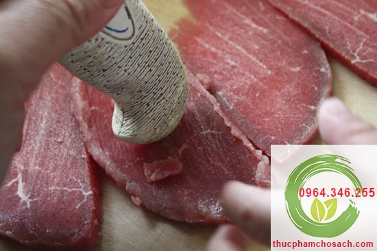 Bước 2: Quay ngược cán dao lại, dùng đầu cán dao đập đập trên bề mặt thịt.