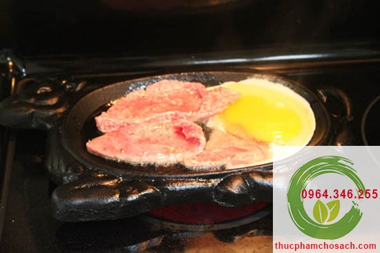 Bước 7: Đun nóng 2 thìa nhỏ dầu ăn, gắp từng lát thịt bò thả vào chảo, chảo cần đun ở lửa lớn, thịt bò chín thì lật mặt khác để thịt chín đều. Đập quả trứng gà thả vào, thêm patê, hay cà chua, hoặc thêm hành tây tùy theo sở thích của bạn. Chảo gang này rất nóng và giữ nóng lâu nên khi bạn đổ thịt bò vào xào rất nhanh chín. Nhấc chảo ra khỏi bếp, để lên miếng gỗ, chảo vẫn rất nóng sẽ làm trứng tiếp tục chín.