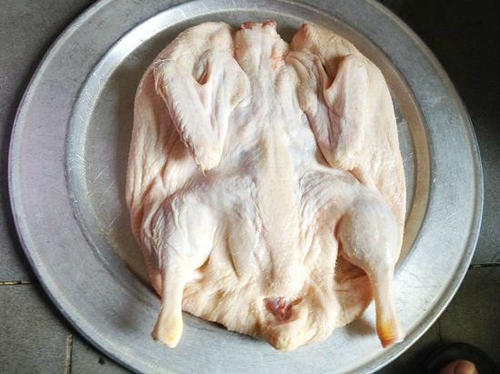 Dùng dao sắc mổ phanh bụng vịt và ép xuống cho vịt nằm bè ra, dùng muối hạt chà xát lên toàn bộ thân vịt nhiều lần để diệt khuẩn và khử mùi hôi, sau đó rửa sạch với nước. Để loại bỏ mùi hôi hoàn toàn của thịt vịt, bạn đập dập một nhánh gừng tươi, trộn với chút rượu trắng rồi chà xát cả bên trong và bên ngoài vịt trong vài phút, làm như vậy đảm bảo vịt sẽ thơm và sạch mùi hôi. Cuối cùng, rửa lại với nước rồi vớt ra để ráo.