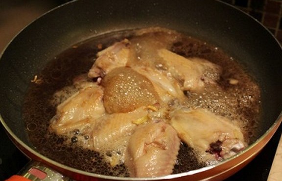 Đổ dầu vào chảo, khi dầu sôi thì chúng ta cho từng cánh gà vào. Chiên khoảng 1 thời gian nhất định, thấy bề mặt đã vàng chúng ta lật lại mặt khác để cho chín đều hai mặt.