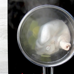 Bước 2 : Nấu 300ml nước cùng với 30gr gừng thái lát và 20ml rượu trắng lên cho sôi, cho bao tử vào trụng sơ cho 2 mặt săn lại rồi vớt ra. Trụng bao tử với nước rượu gừng vừa giúp bao tử dễ cắt vừa giúp bao tử khử mùi một lần nữa. Sau khi trụng bạn gắp bao tử ra để cho bớt nóng rồi dùng dao hoặc kéo cắt thành những miếng nhỏ vừa ăn (sau khi nấu bao tử sẽ co lại bớt, vậy nên bạn đừng cắt nhỏ quá sẽ không giữ được độ giòn của bao tử).