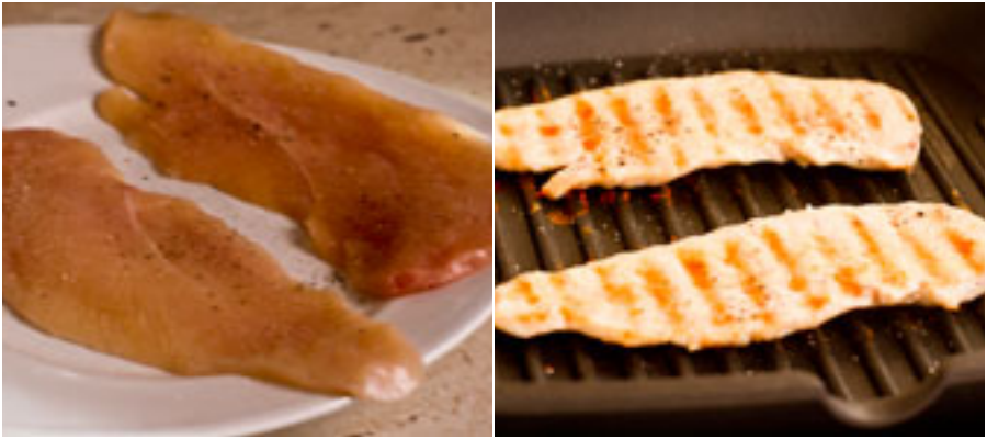 Thịt gà thái mỏng, ướp với chút muối và hạt tiêu khoảng 15 phút. Sau đó đem nướng hoặc áp chảo cho chín.