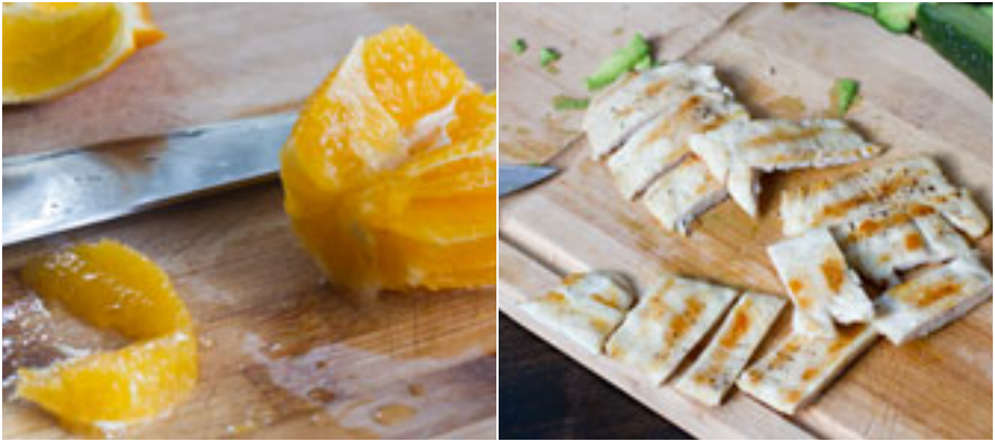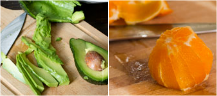 Bơ thái lát mỏng. Cam gọt vỏ.