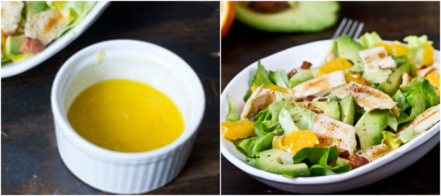 Cho tất cả phần nguyên liệu làm nước xốt vào tô, trộn đều. Cho thịt gà, bơ, cam rau xà lách vào âu.